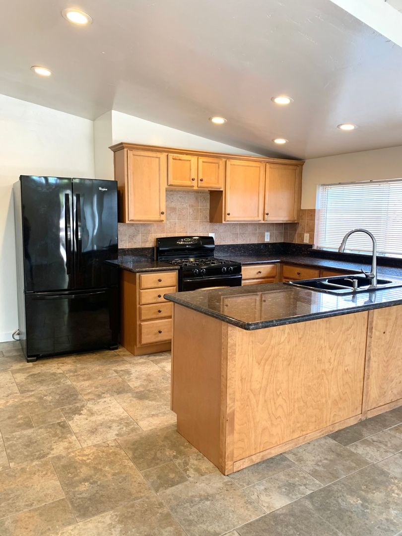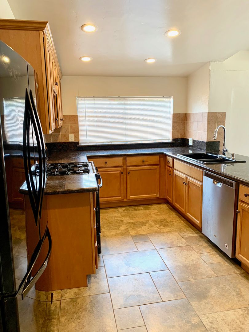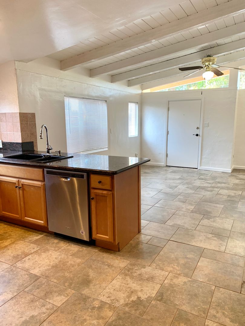 Beautifully updated open kitchen w/tile, granite, garbage disposal, dishwasher, refrigerator, stove and oven